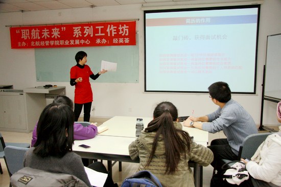 11月30日晚19点,由北航经管学院职业发展中心举办,北航经英荟承办的“职航未来系列工作坊”——赢在简历,扬帆起航在新主楼A1028成功举办。本场工作坊的主讲嘉宾是北航学生就业指导服务中心教育咨询部,全球职业规划师赵敏老师。