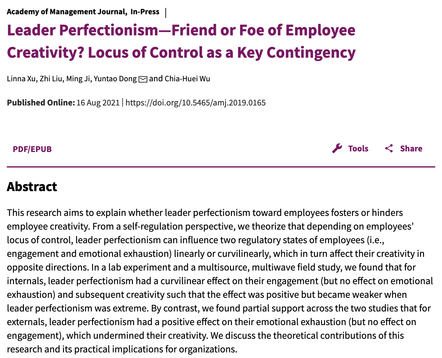 近日,《Academy of Management Journal》刊发我院助理教授徐琳娜及其合作者的研究论文“Leader Perfectionism—Friend or Foe of Employee Creativity? Locus of Control as a Key Contingency”。