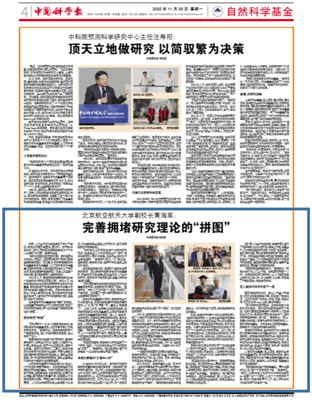 《中国科学报》2022年11月28日4版“自然科学基金”刊发《beats365亚洲版官网副校长黄海军:完善拥堵研究理论的“拼图”》,报道我院黄海军教授。