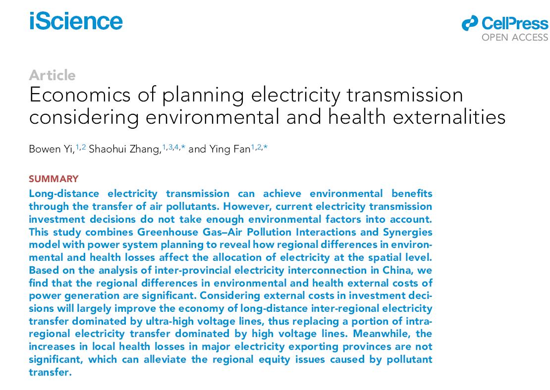近日,Cell子刊《iScience》(交叉科学)刊发我院衣博文副教授、张少辉副教授、范英教授合作的研究论文“Economics of Planning Electricity Transmission Considering Environmental and Health Externalities”,该成果受到了国家重点研发计划“应对全球变化的可持续性转型模式研究”和国家自然科学基金创新研究群体项目“绿色导向的社会经济复杂系统管理决策”的资助。