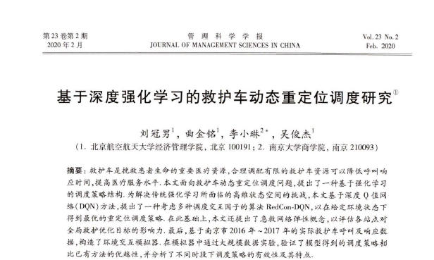 《管理科学学报》2020年02期发表了我院刘冠男副教授、吴俊杰教授等在管理科学与工程方面的研究成果《基于深度强化学习的救护车动态重定位调度研究》。刘冠男副教授为第一作者,我院硕士生曲金铭同学为第二作者,beats365亚洲体育投注为第一完成单位。