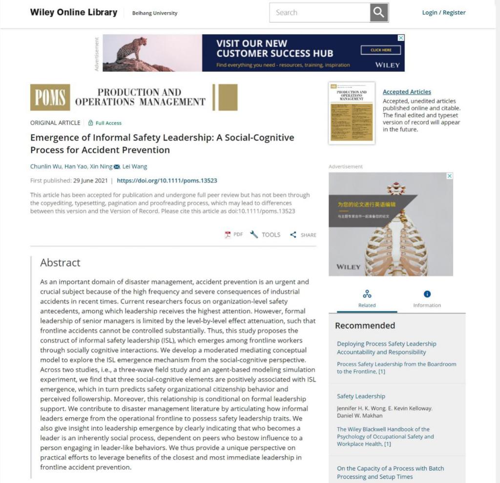 2021年6月29日,《Production and Operations Management》在线刊登了我院吴春林副教授及其合作者的研究论文“Emergence of Informal Safety Leadership: A Social-Cognitive Process for Accident Prevention(非正式安全领导力的涌现:基于社会认知的事故预防)”。吴春林副教授为第一作者,我院二年级硕士生姚涵为第二作者,北航beats365亚洲体育投注为第一完成单位。