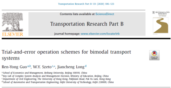 2020年1月,交通运输与运筹管理领域顶级期刊《Transportation Research Part B》发表了我校经管学院郭仁拥教授、香港大学司徒惠源(SzetoW.Y.)教授以及合肥工业大学龙建成教授在多模式交通系统管理方面的最新研究成果“Trial-and-error operation schemes for bimodal transport systems”。
