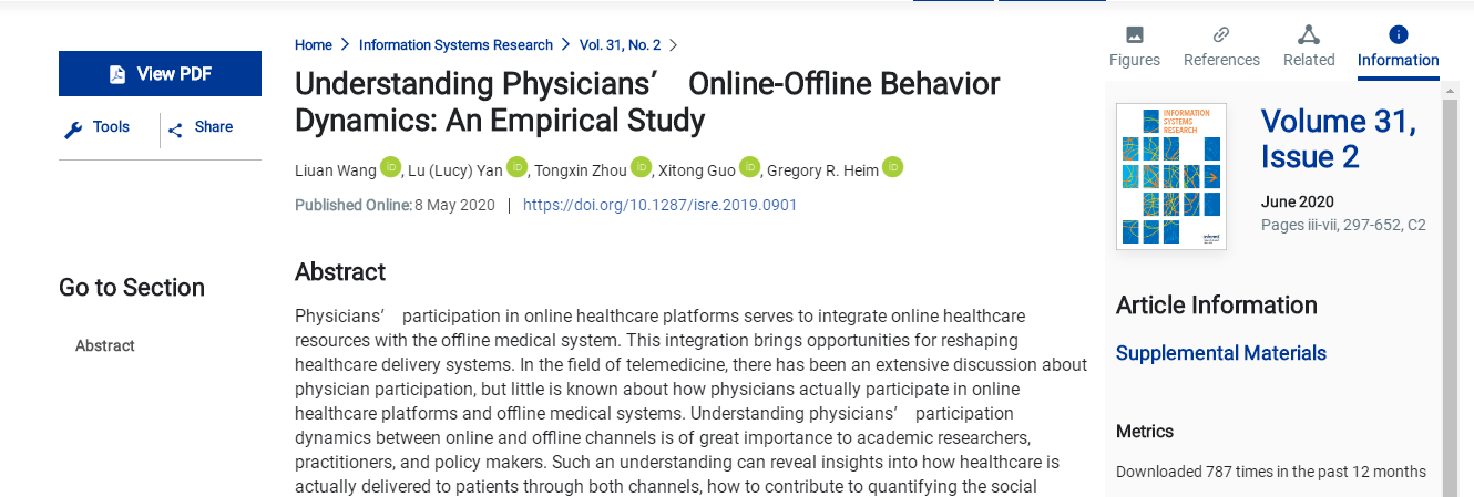 管理信息系统顶级期刊《Information Systems Research》(UTD-24)2020年第2期刊发我院卓百博后王刘安关于医生线上线下行为关系的最新研究成果《Understanding Physicians’ Online-Offline Behavior Dynamics: An Empirical Study》。该研究由我院卓百博后王刘安、美国印第安纳大学Lu(Lucy)Yan副教授、美国华盛顿大学TongxinZhou博士生、哈尔滨工业大学郭熙铜教授、美国德州农工大学Gregory R. Heim教授合作完成。
