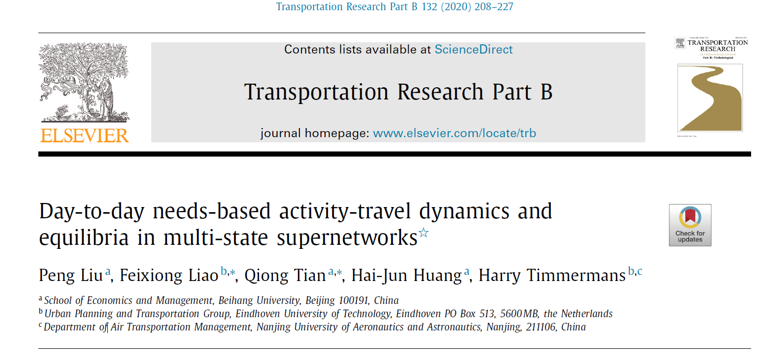 2020年2月,交通运输与运筹管理领域顶级期刊《Transportation Research Part B: Methodological》发表了我院黄海军教授、田琼教授、刘鹏副教授和埃因霍温理工大学Harry Timmermans教授、Feixiong Liao助理教授在链式出行交通流逐日演化规律方面的最新合作研究成果“Day-to-day needs-based activity-travel dynamics and equilibria in multi-state supernetworks”。