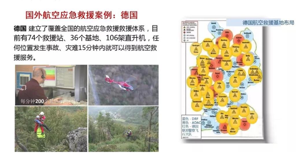 德国建立了覆盖全国的航空应急救援救援体系,目前有74个救援站、36个基地、106架直升机,任何位置发生事故、灾难15分钟内就可以得到航空救援服务。美国有2403架救援航空器,其中直升机1498架,固定翼905架,全国设有301个救援中心,1015个救援点,覆盖84.5%的人口以及60%的洲际公路。全国有300多家专业航空医疗救援公司,年飞行70万小时,救援40多万人次。每年直升机救援运营收入可达40亿美元,其中医疗保险20%,商业保险35%,另外45%来自政府资助、社会慈善捐款和个人付费。