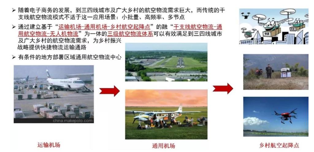 而我们可以通过建立基于“运输机场-通用机场-乡村航空起降点”的“干支线航空物流-通用航空物流-无人机物流”为一体的三级航空物流体系,这样的体系可以有效满足到三四线城市及广大乡村的航空物流需求,为乡村振兴。从战略提供快捷物流运输通路,甚至部分有条件的地方部署区域通用航空物流中心。