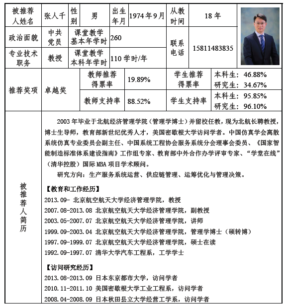 2021年5月26日至6月17日,经学院师生投票推荐、学院党政联席会遴选、师生支持度投票等多个环节,学院拟推荐“立德树人卓越奖”候选人1名——张人千,“立德树人优秀奖”候选人1名——白明。根据《beats365亚洲版官网立德树人奖评选奖励办法(试行)》,为体现公开、公平、公正的原则,现将2021年beats365亚洲体育投注“立德树人奖”拟推荐候选人材料予以公示。