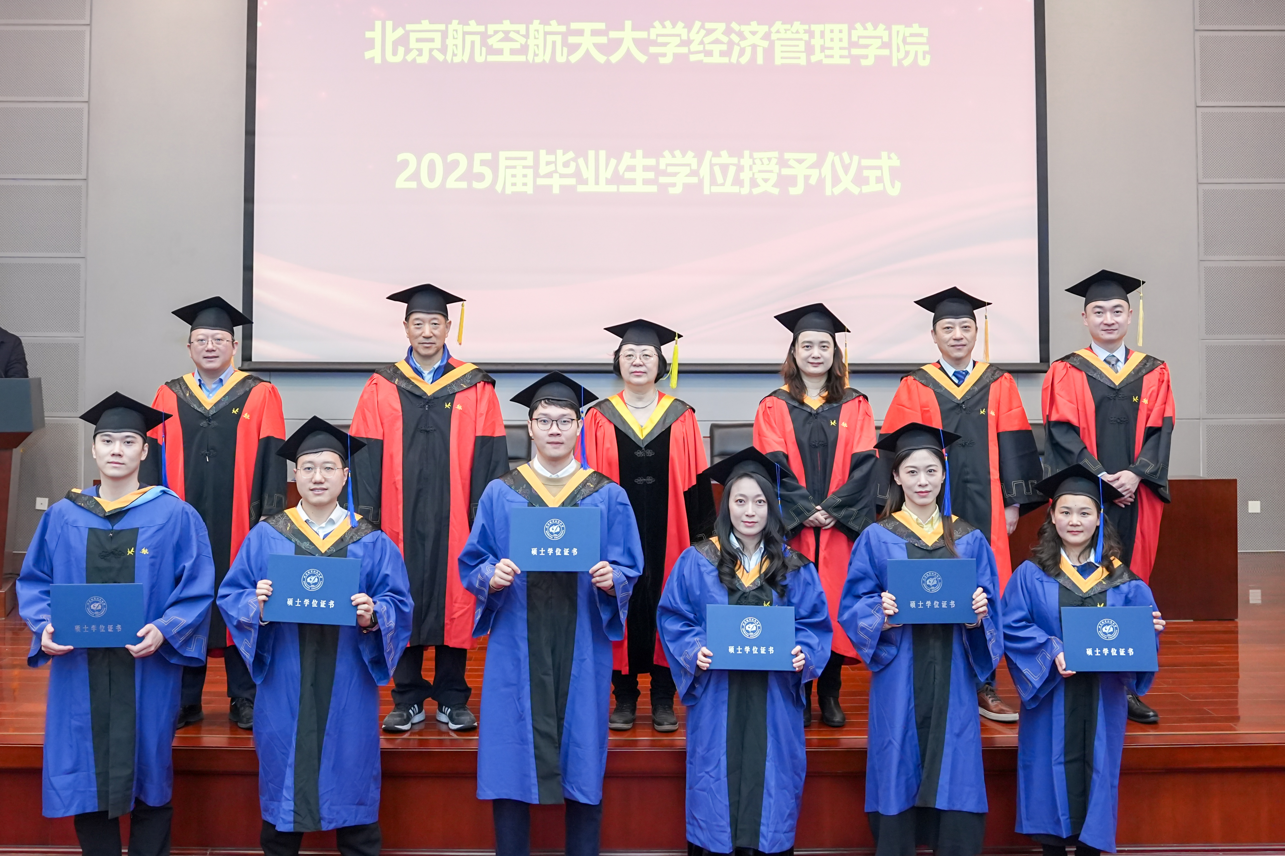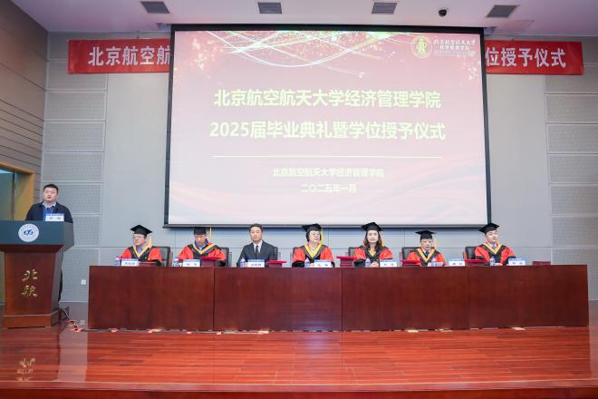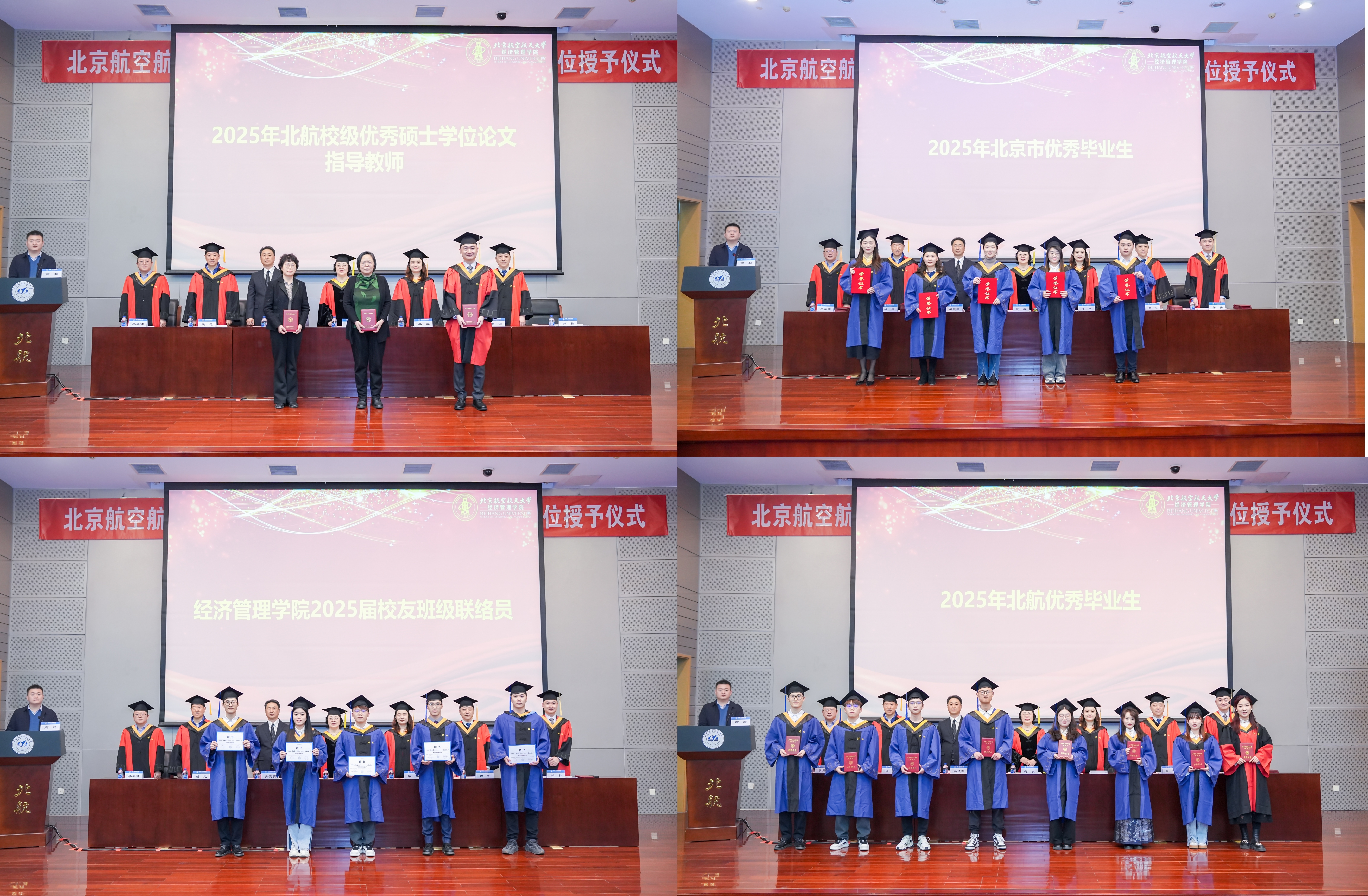 院长范英宣读2025年北京市优秀毕业生名单;副院长牟晖宣读2025年北航校级优秀毕业生名单;学位评定分委员会姚忠老师宣读北航校级优秀硕士论文获得者名单;学位评定分委员会周泓老师宣读北航校级优秀硕士论文指导教师名单;MBA教育中心主任李亚帅老师宣读2025届校友班级联络员名单。主席台领导和嘉宾共同为获奖同学及教师颁发证书,为校友班级联络员颁发聘书。