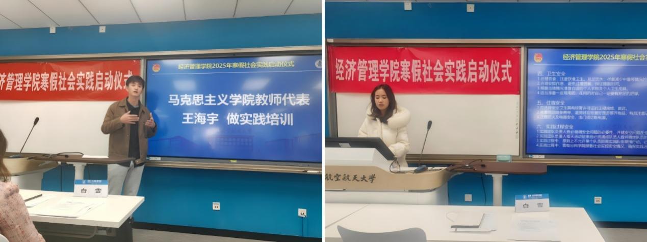 在启动仪式第二阶段,王海宇老师为同学们做了社会实践调研专题培训,通过他在西藏日喀则和日本进行社会调查的经历,提醒同学们要注意调研的方式方法。最后,辅导员蒲红宇对实践队开展了安全教育培训,为实践队筑牢安全底线。