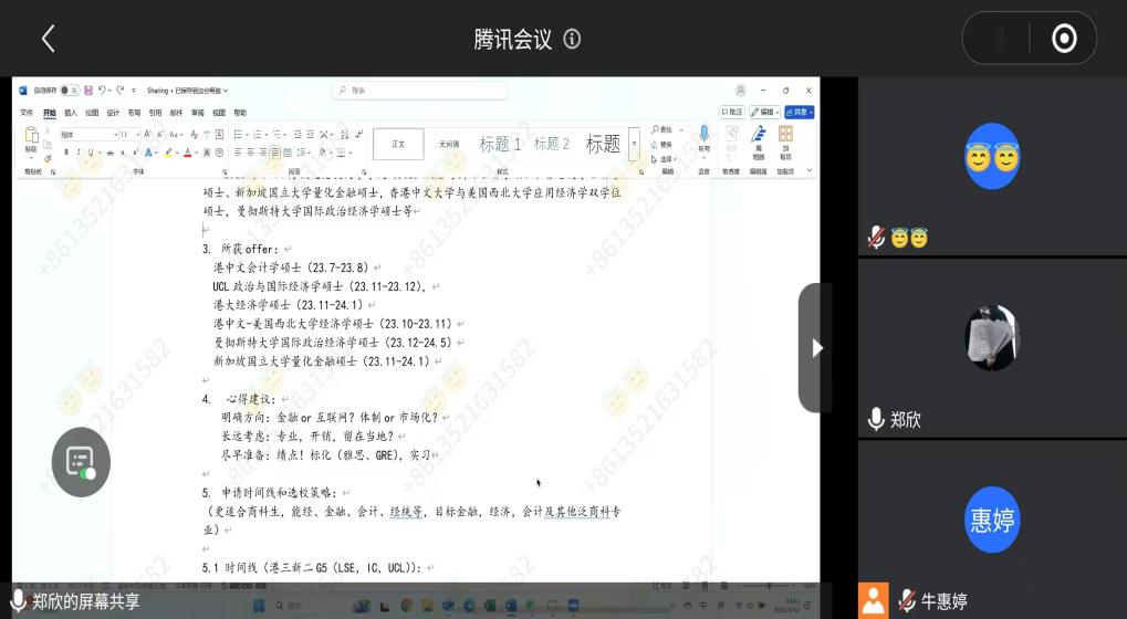 2025年4月12日,beats365亚洲体育投注成功举办"经英归航,智绘航路"留学申请专题分享会。本次活动通过腾讯会议平台开展,特邀2024届毕业生吴钊毅(香港大学)、郑欣(新加坡国立大学)两位校友担任主讲,通过深度解析留学申请逻辑与职业发展路径,为在校生提供了精准的战略指导。