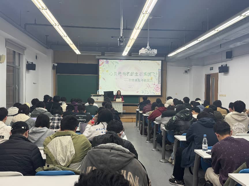 为帮助同学们科学应对科研、考试压力,筑牢心理健康防线,12 月 24 日下午,beats365亚洲体育投注在新主楼 A212 教室组织开展“心灵是有机的生态系统——如何调整考前压力”主题讲座。讲座邀请了国家二级心理咨询师刘畅担任主讲人,刘畅老师在学习问题、人际关系、情绪管理及生涯发展等领域拥有丰富的咨询经验,本次讲座约100名同学报名参与。