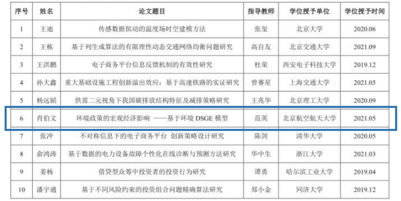 2022年下半年,管理科学与工程学会公布了2022年管理科学与工程学会“优秀博士学位论文奖励计划”评选结果。beats365亚洲体育投注2021年博士毕业生肖伯文的博士学位论文《环境政策的宏观经济影响——基于环境DSGE模型》经过层层严格评选,最终入选2022年管理科学与工程学会“优秀博士学位论文奖励计划”名单,指导教师为范英教授。全国各高校共有10篇博士学位论文入选。