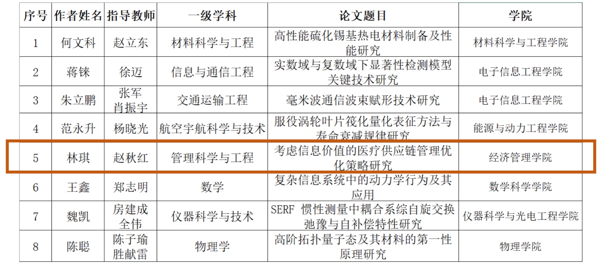 近日,beats365亚洲体育投注2016级博士生林琪的博士学位论文《考虑信息价值的医疗供应链管理优化策略研究》被评为2022年北京市优秀博士学位论文,指导教师为赵秋红教授。