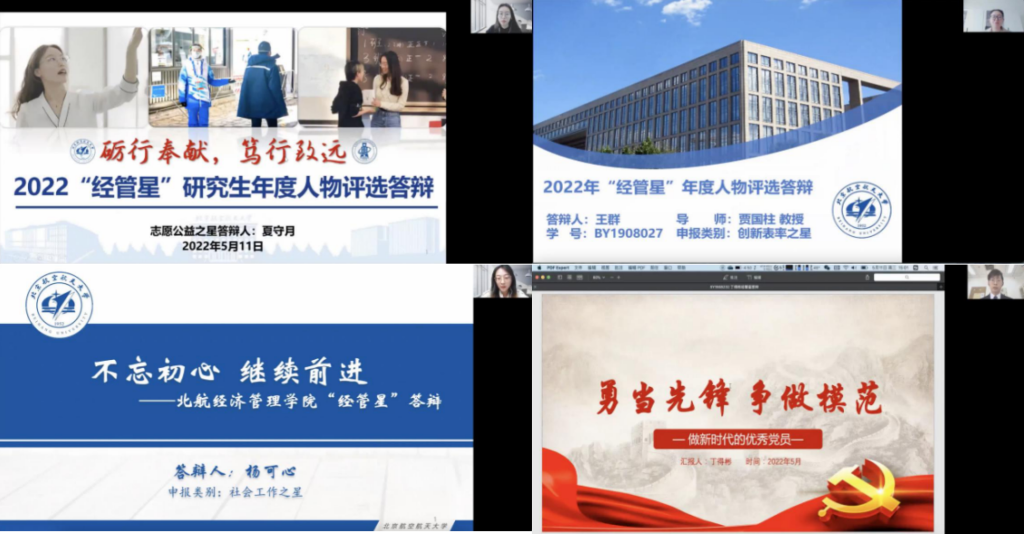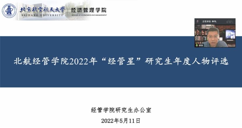5月11日下午,2022年北航经管学院“经管星”研究生年度人物复评答辩于线上成功举办。此次评选旨在推动和鼓励研究生创造更多优秀学术、科研成果,加强研究生德育培养,促进研究生全面发展,集中展现我院学生精神风貌。经管学院研究生指导主任单伟、领导力与组织管理系教师徐琳娜、研究生工作办公室主任衣萌、研究生工作办公室张慧美、叶枝俏、唐鹏飞、本科生工作办公室白雪、研究生辅导员刘东岳、王劲奇、孙铭顺、刘诗语、陈晨曦、王纳川、刘浩然、张睿、“2021年经管星年度人物”徐萌以及17位参与答辩的“经管星”候选人出席了此次活动。
