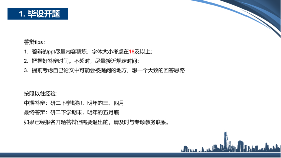 辅导员王纳川首先对同学们顺利完成研一学习任务表示了祝贺,针对同学们近期最关注的问题——毕业论文开题答辩进行了说明。根据专硕教务中心的通知,MEM开题答辩定于9月27日至9月29日,MPACC开题答辩定于9月29日至9月30日,均采用腾讯会议线上答辩。在强调了开题通知后,王纳川又分享了开题答辩的一些经验和后期安排,包括PPT字体、时间控制、回答问题,并介绍了几个常用的查阅文献的网站。