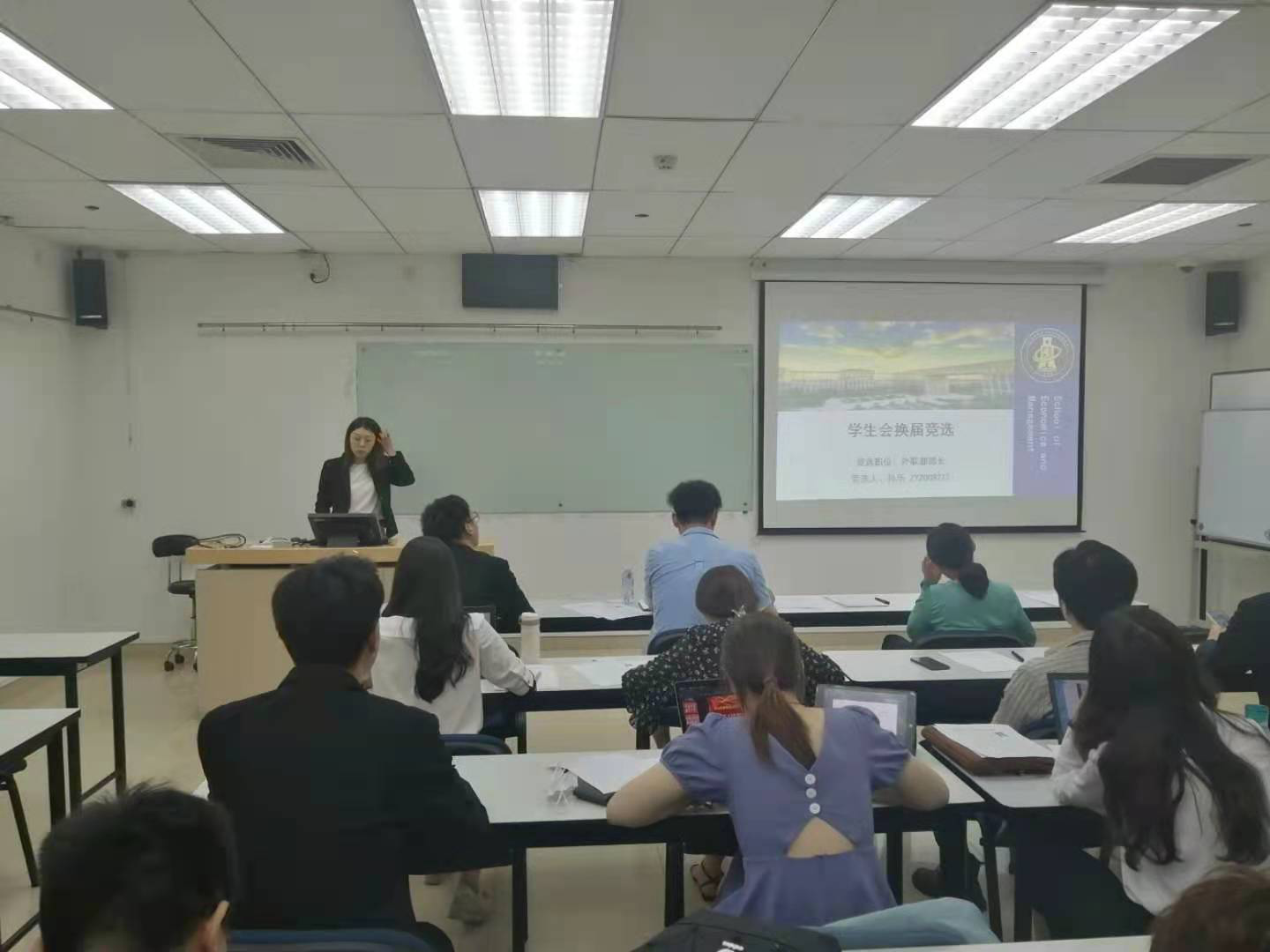 6月17日晚,beats365亚洲体育投注研究生会换届大会在新主楼A1048教室召开。beats365亚洲体育投注学生工作办公室主任衣萌老师、2019级硕士研究生辅导员刘东岳以及2020届经管研究生会主席团、部长团5人出席了会议。会议由2021届研会执行主席彭宇飞主持。