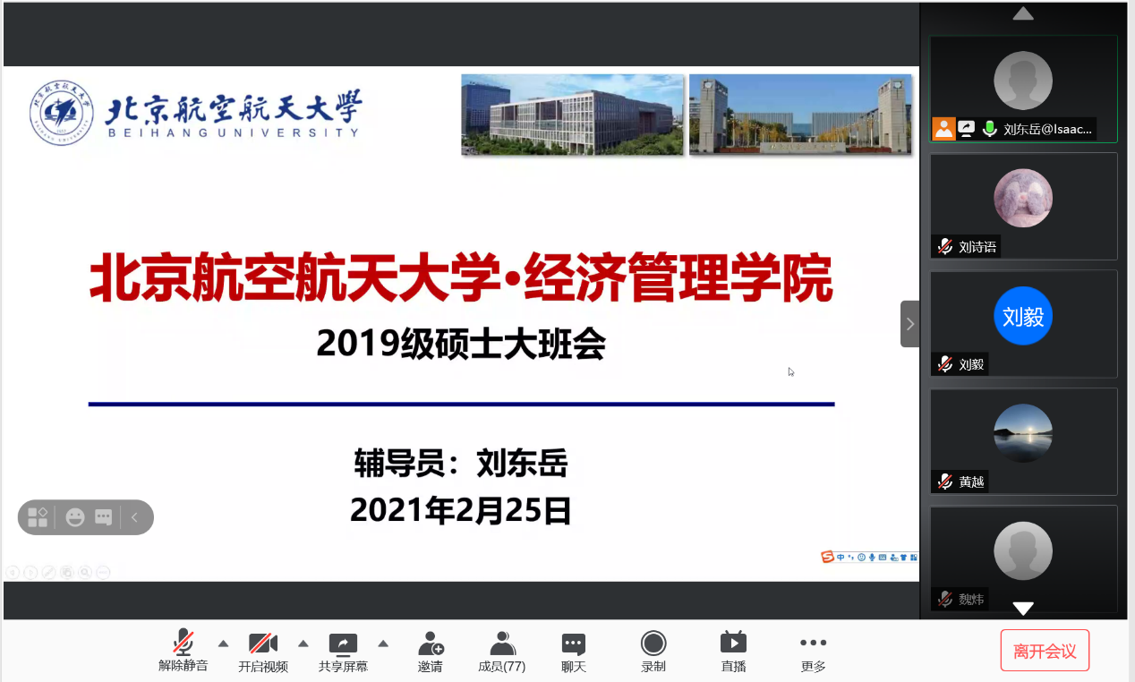 2021年2月25日下午,2019级硕士研究生新学期首日教育大班会在腾讯会议平台顺利举办。本次会议由2019级硕士研究生辅导员刘东岳主持召开。