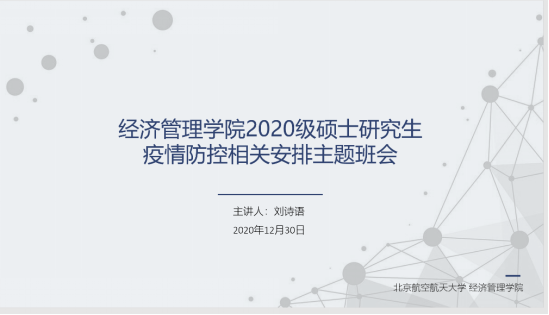 2020年12月30日,2020级硕士研究生疫情防控工作大班会在腾讯会议平台顺利举办。本次会议由2020级硕士研究生辅导员刘诗语主持召开。