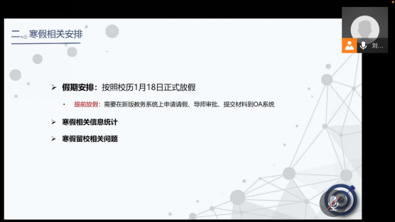 最后,刘诗语辅导员针对寒假的相关安排包括放假时间、寒假离校信息的统计以及申请提前放假离校的手续等问题进行了详细的讲解。