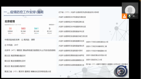 刘诗语辅导员首先介绍了目前北京疫情数据以及全国范围内的23个中风险地区,提醒同学们要时刻重视疫情防控问题,禁止前往任何中高风险地区。