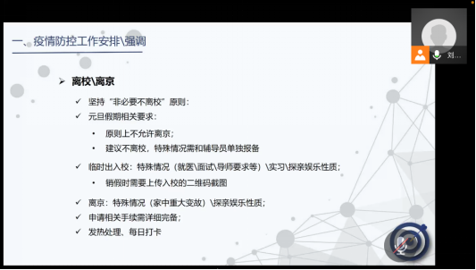 针对目前的疫情形势,刘诗语辅导员提醒学生要时刻坚持“非必要不离校”的原则,并提出了元旦假期期间离京和离校的具体要求;同时针对平时同学们临时出入校的申请做了更加严格和详细的要求。