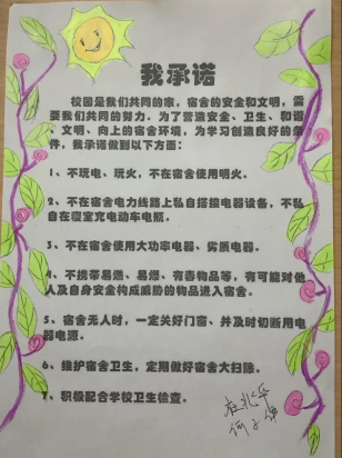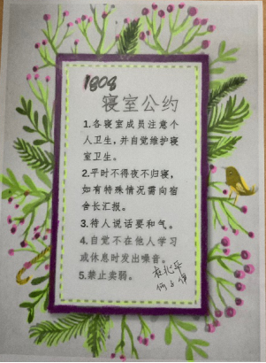 第四周为“礼仪周”:宿舍成员对日常的行为规范和宿舍成员之间的相处方式进行了商讨,共同拟定了宿舍文明礼仪承诺书,并且每个宿舍成员都在承诺书签字确认,在之后的日常生活中互相监督。