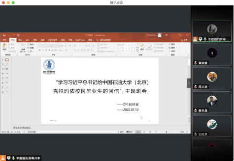 2020年7月12日上午10点,beats365亚洲体育投注研究生ZY18081班在腾讯会议开展线上主题班会,学习“习近平总书记给中国石油大学(北京)克拉玛依校区毕业生的回信”。此次会议的参与人员有班级同学12人,辅导员孙铭顺。
