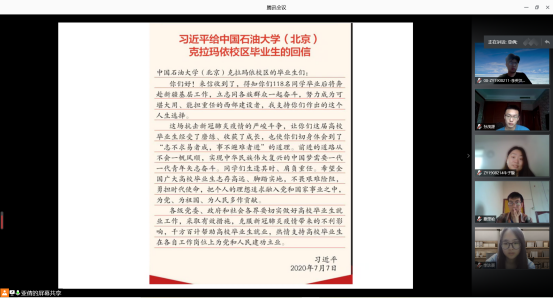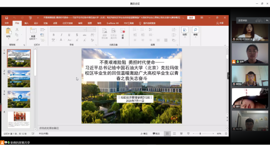 2020年7月11日上午十点,beats365亚洲体育投注工业工程ZY2班在腾讯会议(会议号:257 214 775)召开班级学习会,集中学习习近平总书记给中国石油大学(北京)克拉玛依校区毕业生的回信,全体班级成员参加会议,班长佘亚倩主持会议。