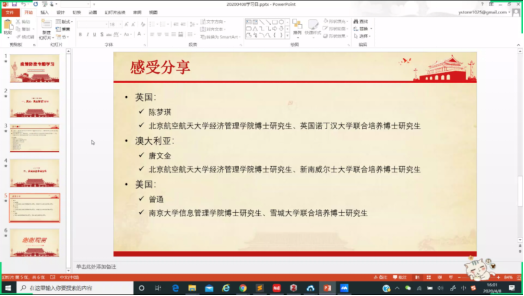 第二个部分是分享学习。通过来自英国、澳大利亚和美国三个不同国家的留学生分享所在国家的抗疫工作情况,了解新冠肺炎疫情在世界各国的基本情况以及中国大使馆对当地留学生的关心和关怀。首先,beats365亚洲体育投注博士研究生、英国诺丁汉大学联合培养博士研究生陈梦琪进行了在线分享。陈同学谈到英国人对新冠肺炎疫情不太重视,并且出门不太喜欢戴口罩。英国的医疗机构不给轻症患者做检测,从而导致很多轻症患者不能得到及时的救治。中国大使馆给在英国的留学生发放了健康包,以帮助留学生对抗新冠肺炎疫情。其次,beats365亚洲体育投注博士研究生、新南威尔士大学联合培养博士研究生唐文金进行了视频分享。唐同学提到澳大利亚政府考虑到经济发展等因素,所采取的防控措施并没有中国采取的防控措施那么严格,从而使得澳洲的疫情没有得到有效的控制。在物资供应方面,澳洲出现了物资供应不足的现象。人们需要一大早进行物资采购,否则可能出现物资短缺。中国驻澳洲领事给澳洲留学生建立了相关微信群,实时更新疫情相关的信息。大使馆也从国内联系口罩供应商,组织线上讲座,帮助留学生认识新冠肺炎疫情、解决留学生口罩短缺的问题。最后,南京大学信息管理学院博士研究生、雪城大学联合培养博士研究生曾通进行了视频分享。曾同学说大部分美国人都处于居家的状态,并且学校都改为线上授课的形式,并设置专门的版块实时分享疫情相关的信息,以帮助学生了解最新的疫情资讯。在物资供应方面,美国各大超市对居民购买物资的数量进行了限制,所以美国各大超市的物资供应相对充足。中国大使馆也与在美留学生保持联系,并在有必要时提供力所能及的帮助。