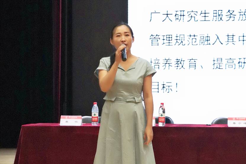 典礼结束后,由研究生工作办公室主任衣萌老师结合《研究生手册》为2019级研究生做了新生入学教育。衣萌老师非常耐心地对同学们的学习和生活都做了细心的指导,重点提到了出行安全、宿舍安全和学术诚信等方面的内容,深切表达了对同学们的关心。