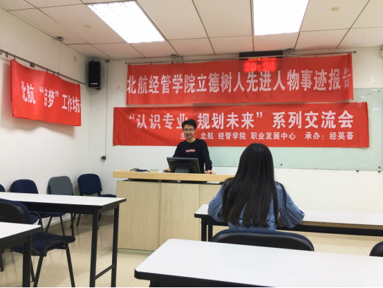2019年3月27日晚19:30,于新主楼A1048,“认识专业,规划未来”系列交流会暨北航经管学院立德树人先进人物事迹报告成功举办。本次交流会主要面向经管学院研究生一年级的同学,为迎接即将来到的秋季招聘季,我们邀请到了现就职于中国铁路北京局集团有限公司的闫东明学姐,以及拟就职于中国建设银行总行的陶世凯学长和拟就职于德勤华永会计师事务所的张书霖学姐,他们就求职前的准备、求职过程中的经验进行了一个分享,为在校的同学们答疑解惑,树立了求职信心。