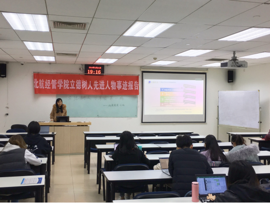 2019年3月21日晚19:00在新主楼A1028,北航经管学院立德树人先进人物事迹报告第一场——优秀党员专场顺利举办。本场先进事迹报告,荣幸邀请到了2018年北航经管学院“经管星”的两位获奖者——曹文颖和张书霖,她们就自身的事迹与经历和大家做了分享,充分展现了一名党员在工作和生活中的模范带头作用,使在场同学深受触动。