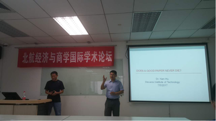 2017年7月5日下午,在新主楼A928教室,美国斯蒂文斯理工学院(Stevens Institute of Technology)商学院Nan Hu副教授应邀来我院参加北航经济与商学研究生国际学术论坛,并作了题为“Does A Good Paper Never Die?”的学术报告。我院20余名师生参加,报告会由单伟副教授主持。