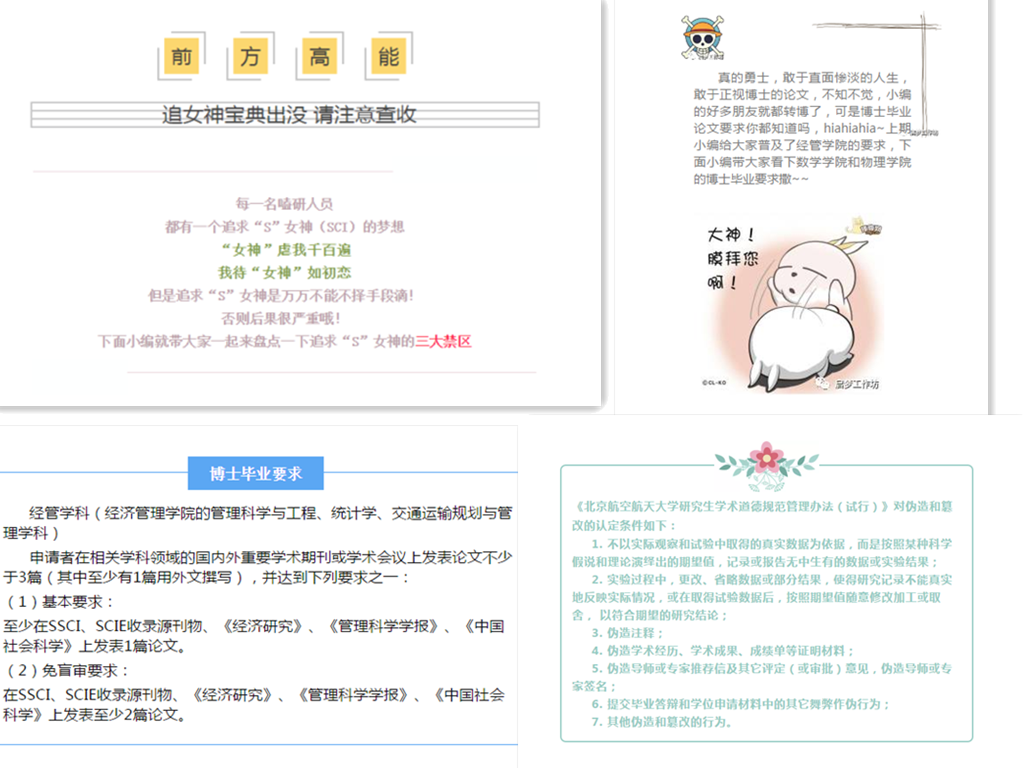 为严明学术纪律,规范学术行为,维护学术声誉,促进学术繁荣,进一步营造优良学风,引导研究生树立正确的价值观,培养严谨诚信的自主创新人才,根据国家相关法律法规和《beats365亚洲版官网教师学术道德规范》、《beats365亚洲版官网学生违纪处分规定》和《beats365亚洲版官网学位授予暂行实施细则》,结合我校实际情况,借助北航“启梦”工作坊公众号,推出“北航学术道德与科研诚信朋友圈警示”系列推送活动。