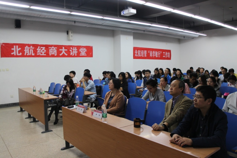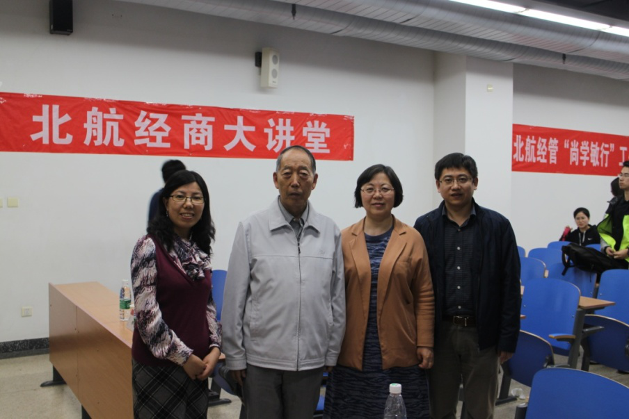 2017年4月24日,著名概率论与随机分析学家、中国科学院院士严加安作客“北航经商大讲堂”、“北航经管‘尚学敏行’工作坊”,作“我心目中的科学与艺术”为题的讲座。本次讲座在新主楼A212举行,由范英院长主持,研究生指导主任单伟副教授、李平教授、韩立岩教授、刘善存教授、赵尚梅教授、周建涛副教授、王晨岚老师出席此次讲座,另外还有70余名师生参加了讲座。