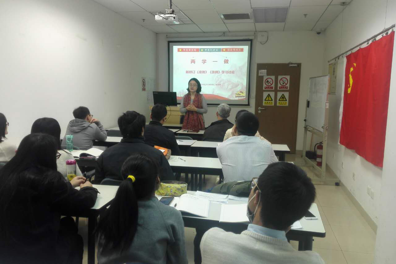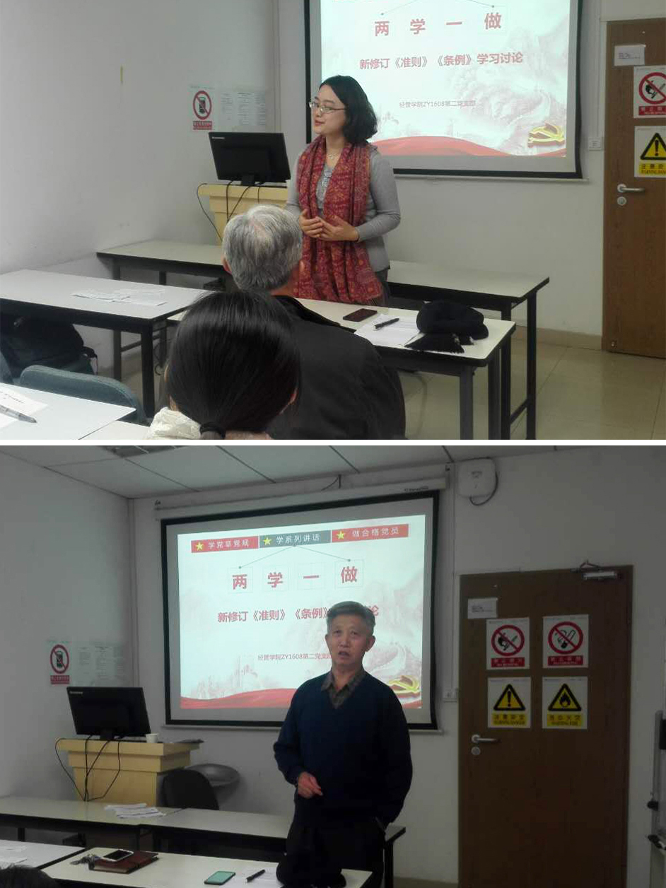 11月28日,经管学院ZY1608第二党支部召开党员大会,围绕《关于新形势下党内政治生活的若干准则》和《中国共产党党内监督条例》举办微党课进行学习交流,副院长牟晖老师、离退休教工党支部书记李清老师到会指导。