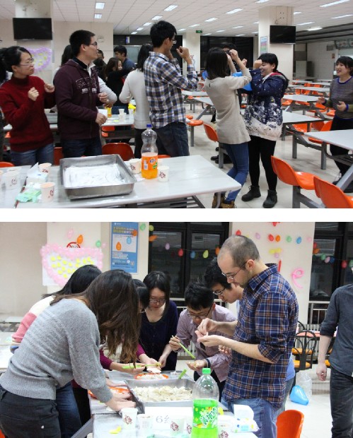 晚上7点30分,伴随着欢快的音乐,包饺子活动在潘娜和郑润民同学的精彩主持下拉开帷幕。大家将食堂工作人员和好的面和饺子馅儿以传气球、比速度的方式抢到手后,火速开始着手包饺子。短短十分钟,每一组都为了争当包饺子第一名而大显身手,通力合作,很快饺子盘就被摆的满满当当。为了增进男女同间的互动和默契,在煮饺子间隙进行的“你划我猜”的游戏,更加势均力敌,经过几轮厮杀才决出优胜。在最具期待的吃饺子大赛中,男女搭配喂饺子的游戏规则让男女生有了更进一步接触的机会,非常有爱。不出意外地,活动的最后的表白环节将全场的气氛推向了高潮。整场活动欢声笑语,气氛温馨热烈。