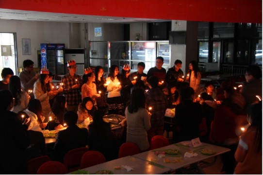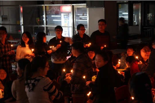 在这特殊的节日里,活动负责人还为同学们准备了特殊的节目。主持人宣布最后一个节目是为12月份过生日的所有同学送上最温暖的祝福。每位同学都点起了蜡烛,为所有过生日的同学唱起了生日快乐歌。