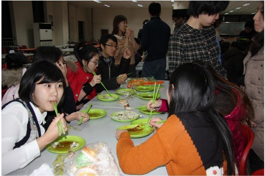 外面地上的雪还没有化,为节日的到来增添了浓厚的氛围。到场的同学都无比高兴,每个人的脸上都洋溢着微笑。餐厅的师傅们早早就把桌子和椅子摆放完毕,并铺上了保鲜膜。活动在愉快的氛围中拉开帷幕,首先展开的是包饺子比赛。主持人将到场的人分为八个船舱,每个船舱8人。主持人讲完比赛规则后,各个船舱便开始动手包起来,组员分工明你确,有人擀皮,有人包,有人则负责把饺子摆放好,这个比赛不仅考验了同学们的动手能力,更考验了同学们的团结协作能力。比赛结束后,每个船舱派出一名同学组成评委,根据每个船舱包的饺子数量和质量进行打分,最后根据得分评出了比赛前三名并对获奖者给予了奖励。