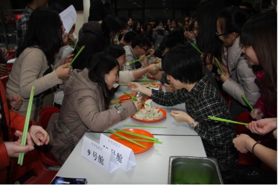 接下来,每个船舱将包好的饺子交给食堂师傅,不一会的时间,饺子便煮好了,主持人宣布就第二项活动——吃饺子比赛正式开始,比赛规则为每个船舱选出两个人,然后把饺子喂给对方,最短的时间内吃掉规定数量的饺子的船舱获胜,经过激烈的角逐,六号船舱获得第一名,并获得了主办发颁发的“最佳吃货奖”。比赛结束后,大家迫不及待的拿起筷子来品尝自己亲手做的饺子,同学们一边吃一边评论包的饺子,欢声笑语,尽在其中。