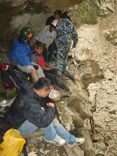 途中两位志愿者要我们把他们放到他们方便去德阳的路上就好,但是我们认为既然不能为灾区同胞做更多,就为救灾英雄们尽绵薄之力吧。大家一致认为应该把他们送到德阳。