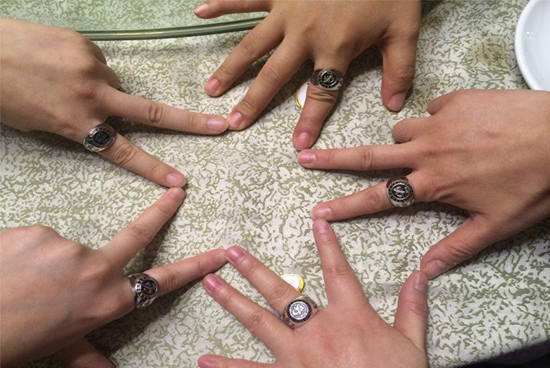 为了纪念这一刻,王勇同学倡议定制毕业班级戒指以使这一刻实现永恒(学委白盏的左手霸气侧露):
