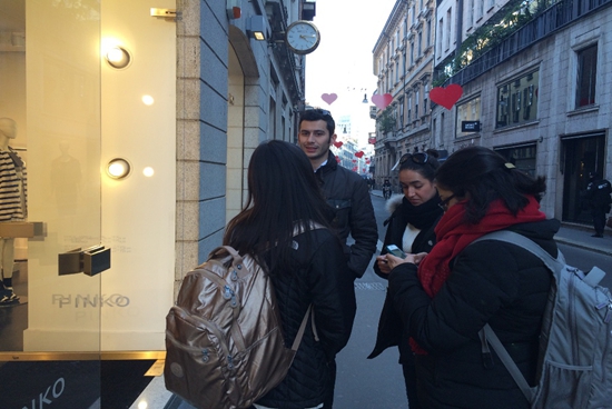 之后,由Altune Naiara以及 Chaudio Dell’Era教授带领我们进入了Mistery Shopping的阶段。在他们讲解完毕对于Mistery Shopping的要求后,我和德国大妞儿Nevine,中美洲美女Marce,南美来的Gisi小姐以及米兰本地帅哥Matteo分到了一组,从学校附近的Bovisa火车站出发,奔向Garibaldi以及威尼斯街上的商业区进行调研。我们的目的地是意大利本土奢侈品品牌Pinko。