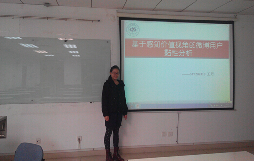 第一位宣讲人是王丹,题目是《基于感知价值视角的微博用户黏性分析》,站在感知价值的角度对微博网站的用户黏性进行了分析。通过对168名微博用户发放调查问卷,收集数据。运用验证性因素分析与路径分析的方法验证假设与模型是否合理。最终得出用户感知价值是如何影响微博用户黏性的,并为怎样提高用户黏性提出合理的建议。第二位宣讲人是罗婷,题目是《考虑延误时间成本的最优路边停车策略研究》,研究了延误时间成本作用下,出行者面对路边停车空位随机分布的寻位策略选择。第三位宣讲人是王军,题目是《大数据处理技术在生产质量跟踪中的应用》,采用Hadoop技术,设计了部署于企业私有云平台的分布式技术架构。实施了企业范围的数据采集与迁移工作。并在大数据平台之上,开展了数据分析与可视化的工作。论文作者的精彩讲解赢得了在场同学的热烈掌声。