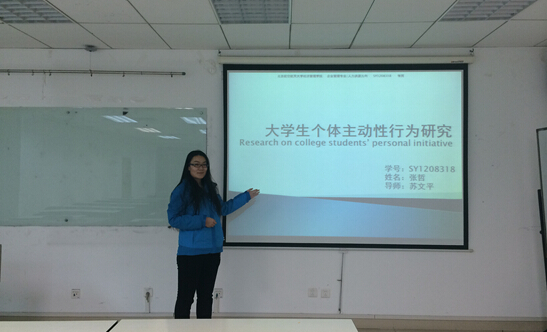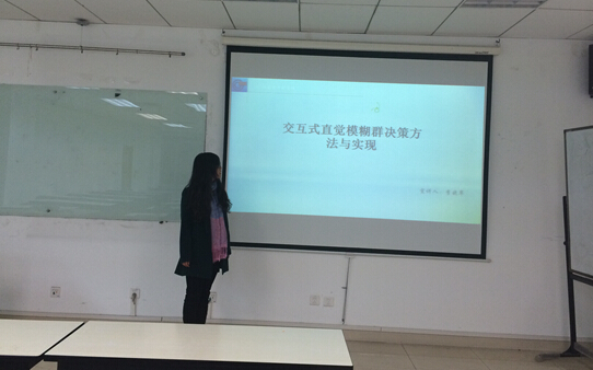 李晓翠同学的宣讲题目是“交互式直觉模糊群决策方法与实现”,她介绍了一种时间权重的确定方法,建立了交互式直觉模糊群决策的改进模型。模型中决策者在不同的时间段进行决策,用直觉模糊数表述决策者的决策信息。整个决策过程应用扩展的TOPSIS方法,利用时间权重实现多时间段决策信息的综合加权。在具体的计算过程中,首先针对单一决策者求得各个方案与正理想解的相对贴近度,以此作为属性值,获得群决策者相对贴近度矩阵,进而求得在群决策的情况下各方案的相对贴近度,根据此值实现最终群决策的方案优选。最后介绍了应用此模型实现防空案例方案的优选,验证了模型的可行性、科学性和合理性。张哲同学的宣讲题目是“Research on College Students’ Personal Initiative”,她主要介绍了对大学生个人主动性的研究。