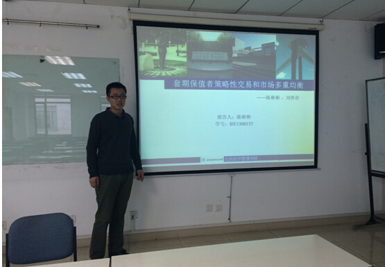 第一位宣讲人是孙欧,题目是《上市银行政府持股比例与货币政策传导效率》,应用2007-2012 年中国上市银行季度数据,创新性的构建货币政策效率指标,并分别通过分组定性分析和数值定量分析建立面板数据模型,研究银行政府持股对货币政策传导效率的影响。第二位宣讲人是王斯宁,题目是《自媒体营销的平台选择策略评述》,首先对自媒体的基本内容进行回顾与总结。其次总结了企业在自媒体平台上的营销发展现状,进而总结了自媒体营销面临的问题。最后为企业自媒体营销的平台选择提出了相应的策略。第三位是陈彬彬,题目《套期保值者策略性交易和市场多重均衡》,从金融市场微观结构理论出发,通过分析知情交易者交易策略和做市商定价策略对套期保值者交易的影响,构建了套期保值者策略交易模型。论文作者的精彩讲解赢得了在场同学的热烈掌声。