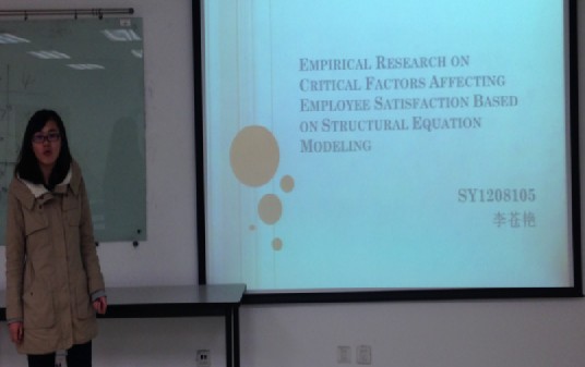 参加此次宣讲会的作者们都精心准备了他们的论文和PPT,宣讲会由李苍艳开场,她的论文题目是《Empirical Research on Critical Factors Affecting Employee Satisfaction Based on SEM》,文章从多个方面对联想集团的员工满意度进行了研究,并建模完成可靠性和适应程度分析,这一方法在参考员工满意度的管理企业方面有一定的可行性和实用价值。紧接着是于浩,他的论文题目是《基于结构方程的突发事件微博转发意愿影响因素建模及分析》,使用的基于结构方程理论对于提出的影响因素假设进行显著性检验,最终得到验证了3个假设不成立,而2个假设的正确性,并由此提出主要的影响个人转发意愿的影响因素是获得认同性和主观表达的意愿,这对于政府等应急管理的决策者了解突发事件发展的态势和公众的反应,从而对事件做出妥当地处置,具有十分重要的意义。宣讲会的最后一篇论文是来自李亚博的《我国银行业顺周期性的形成机理、表现及逆周期监管》,文章首先对金融系统顺周期性和银行逆周期监管的相关理论作简单评述;接着从内部因素和外部因素两个角度分析银行顺周期的形成机理,并在此基础上重点讨论我国银行业顺周期性的表现;最后对当前逆周期资本监管工具进行了总结。