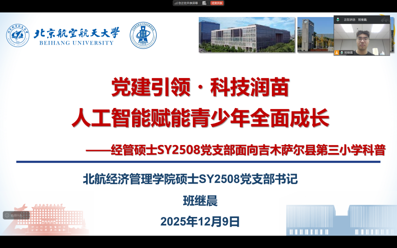 为深入践行党建引领教育帮扶使命,让偏远地区青少年近距离感受科技魅力、拓宽知识边界,2025年12月9日下午,beats365亚洲体育投注硕士SY2508党支部联合北航第二十七届研究生支教团吉木萨尔分团,为新疆吉木萨尔县第三小学的同学们带来了一场主题为“人工智能赋能青少年全面成长”的科普宣讲。党支部书记班继晨担任主讲人,用生动通俗的语言为同学们开启了探索AI世界的大门。