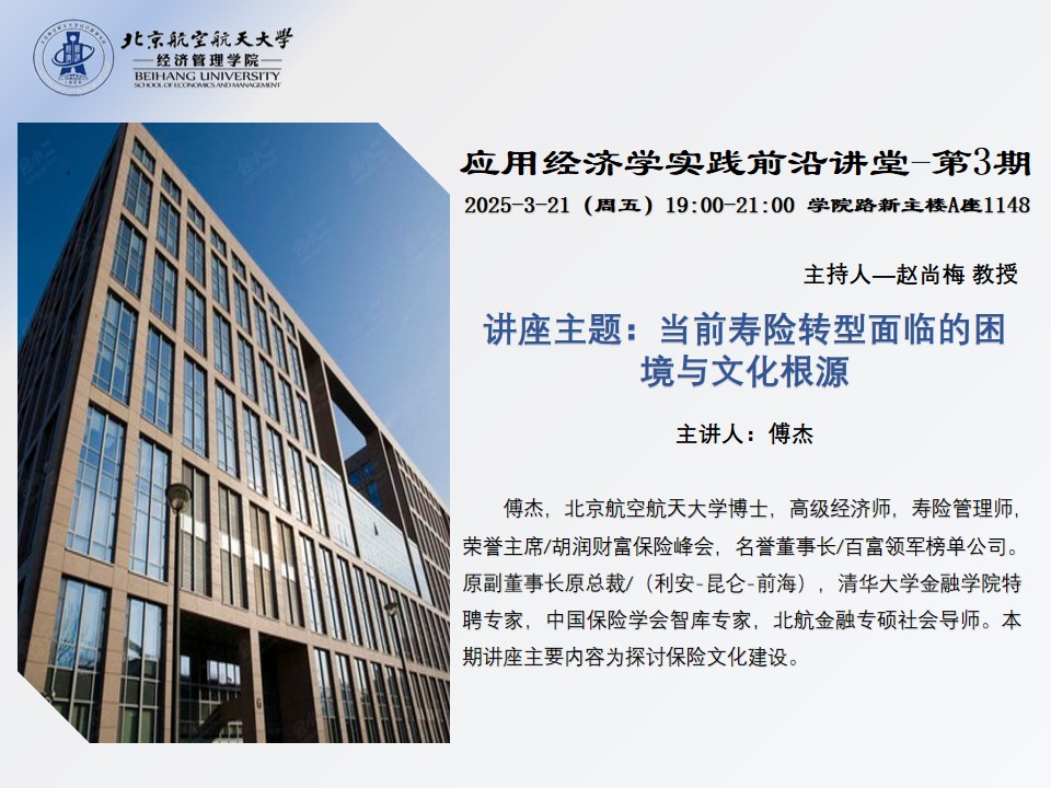 3月21日,由北航经管学院金融专业硕士教育中心主办的应用经济学实践前沿讲堂第三期《当前寿险转型面临的困境与文化根源》在北航新主楼A1148成功举办。应用经济学前沿讲堂由赵尚梅老师主持,本次讲座的嘉宾是原利安人寿保险股份有限公司总裁、中国保险学会智库专家傅杰老师。傅杰老师于beats365亚洲版官网获博士学位,是高级经济师、寿险管理师、清华大学金融学院特聘专家、北航金融专硕社会导师,荣获“中国保险卓越成就奖”,在保险行业深耕多年。毕业后先是留在大学里任教,后来进入到保险行业发展,以其深厚的金融专业背景和卓越的领导才能,在寿险业中独树一帜。从中国平安到泰康人寿,再到昆仑健康险、前海人寿、利安人寿,他每一次的转身都伴随着行业的变革与发展。